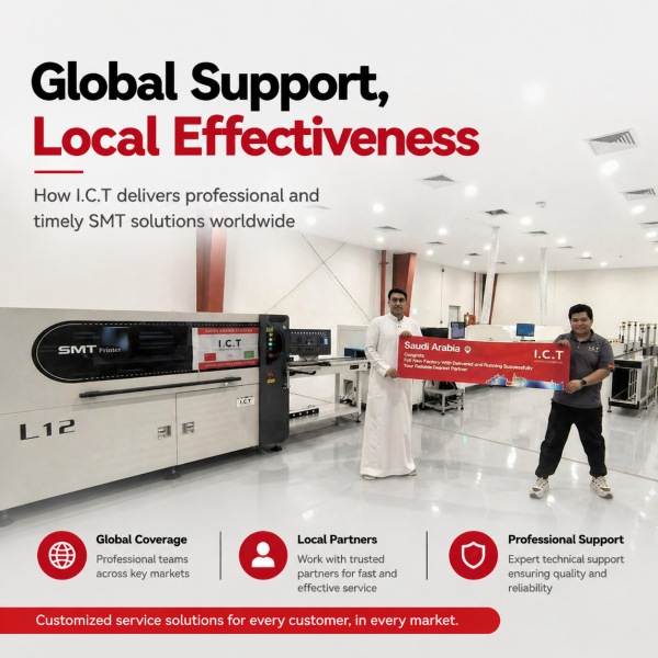 На таких рынках, как Саудовская Аравия , где местный опыт SMT в отрасли может быть ограничен, I.C.T вмешивается для предоставления комплексной технической поддержки. Наша команда берет на себя полную ответственность за установку, обучение и устранение неполадок, гарантируя, что клиенты получат профессиональное и своевременное обслуживание непосредственно от наших специалистов.